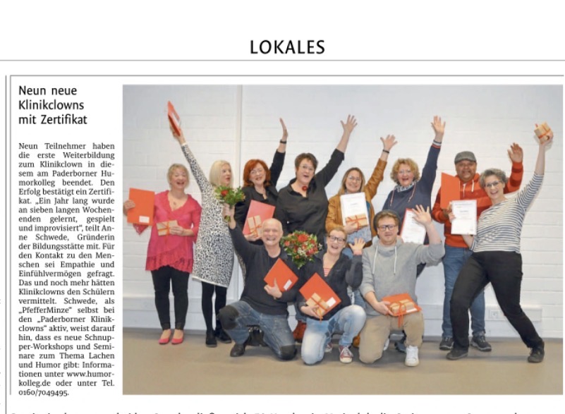 In diesem Jahr haben laut Klinikclown-Gründerin Anne Schwede neun Teilnehme die Weiterbildung zum Klinikclown am Humorkolleg in Paderborn beendet. Ein Jahr lang wurde an sieben langen Wochenenden gelernt, gespielt und improvisiert. Ein Klinikclown zu sein, bedeutet, mit den Menschen in Kontakt zu kommen.